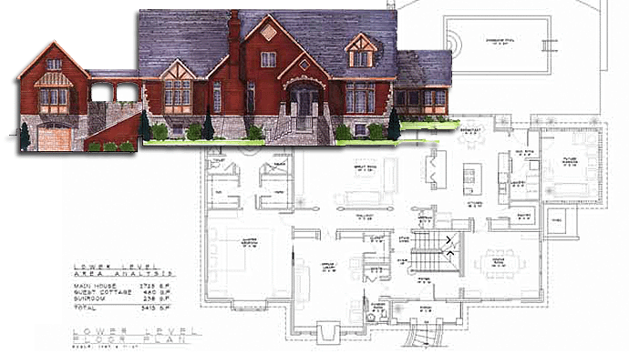 A tudor home with a guest cottage, and a home office/nursery, tucked into a hillside site.